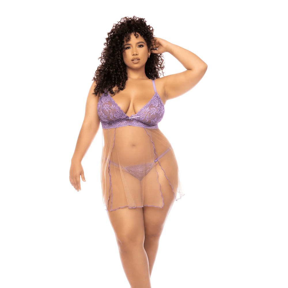 Indulge in a refreshing and feminine style perfect for cozy mornings of breakfast in bed with this lace and transparent tulle babydoll. Featuring side slits, adjustable shoulder straps, and a wide silhouette, it offers both comfort and elegance. Complete the look with the matching thong for a touch of sophistication, creating an ensemble that exudes charm and allure.